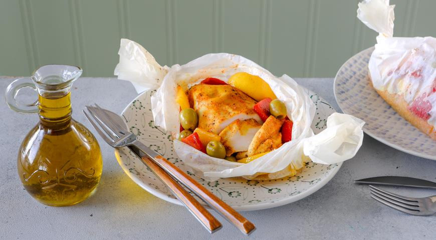 ✅ Поднимите длинные края бумаги над курицей, соедините их и заверните. Открытые концы “конверта” закрутите, как фантик конфеты. Подогните закрученные концы под курицу и выложите на противень. Поставьте в центр духовки и запекайте 15–18 мин., в зависимости от толщины филе. Дайте курице “отдохнуть” в конверте на тарелке 5 мин. Затем разверните и подавайте прямо на бумаге.