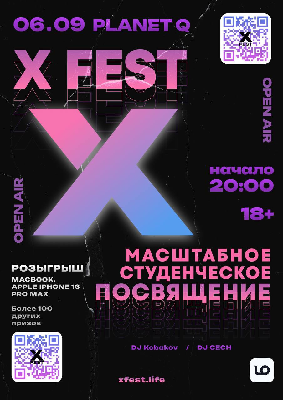 X-FEST 2025 — твой главный вход в студенческую жизнь! 6 сентября мы взорвём PLANET Q. Никаких полумер: громкий звук, толпа из 3000 студентов, жара до рассвета. На сцене — DJ Kobakov и DJ CECH. Главный розыгрыш вечера — MacBook, iPhone 16 Pro Max и сотня других призов. Тут заводят знакомства, которые останутся на всю жизнь. Тут берут телефон у того, кого ты ещё вчера видел только в подписках. Тут ты поймёшь, что Барнаул — это столица мира. 06.09 | 20:00 |18+ FC/DC Билеты: xfest.life Подписывайся на наши соцсети, чтобы не пропустить новости о главном студенческом событии этого учебного года. Выбирай: быть в истории или читать о ней в сторис. @xfest2025