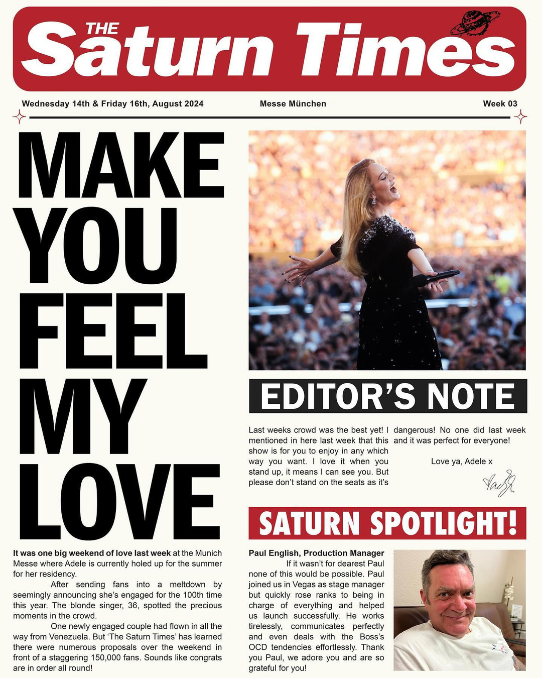 After years of putting up with the tabloids, I decided to join in on the fun and create my own for the Munich shows. When I tell you it was a highlight of my week to write and create these every Sunday after the shows…I think I missed my true calling! A friendly piss take on myself and the real ones! Truly, it is so much fun writing absolute nonsense! 🪐