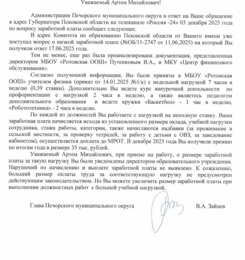 Слыш, работать. Ещё больше. В Пскове работает учитель физики по имени Артём Лапин. Молодой человек, помимо своих уроков, берет дополнительную нагрузку. Артём ведет занятия по баскетболу, робототехнике и профориентации. Плюс учитель занимается с детьми-инвалидами. За всё это дело мужчина получает 12 000 рублей. На прямой линии губернатора Артём попросил у владыки региона хоть небольшую надбавочку. Чтобы хватало хотя бы на несколько дошиков в месяц. Губер просьбу услышал и передал вниз подчиненным. Ответ последовал от главы Печорского района Валерия Зайцева. Чинуша заявил, что денег нет, но вы держит… Валерий не стал косить под более известного коллегу, а просто выдал базу: чтобы больше получать, нужно больше пахать. Как учитель физики сам до такого не додумался – непонятно. Стоит устроить внеплановую проверку на профпригодность преподавателя. Давайте поможем советом как прожить на 12к в месяц