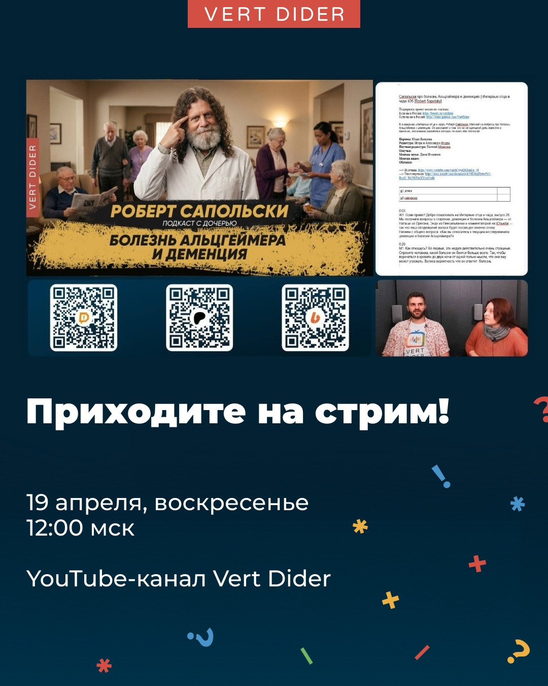 📣Так, без лишних слов: 19 апреля в 12:00 мск — новый стрим! Неделя выдалась напряжённой, поэтому приходите в воскресенье поболтать, обсудить новости и разобрать раньше релиза новое видео Роберта Сапольски — очередной выпуск «Интервью отца и чада» в нашей озвучке. Отслушаем ролик на ошибки/оговорки вместе с вами, чтобы потом отдать его на доработку и уже выложить в общий доступ. Ставьте напоминалки: ⏰ 12:00 мск 🗓 19 апреля, воскресенье Встречаемся на нашем YouTube-канале — https://www.youtube.com/@VertDiderScience Ставьте плюсики в комментариях, кто придёт, поглядим на вас☺ #анонс@studio_vd