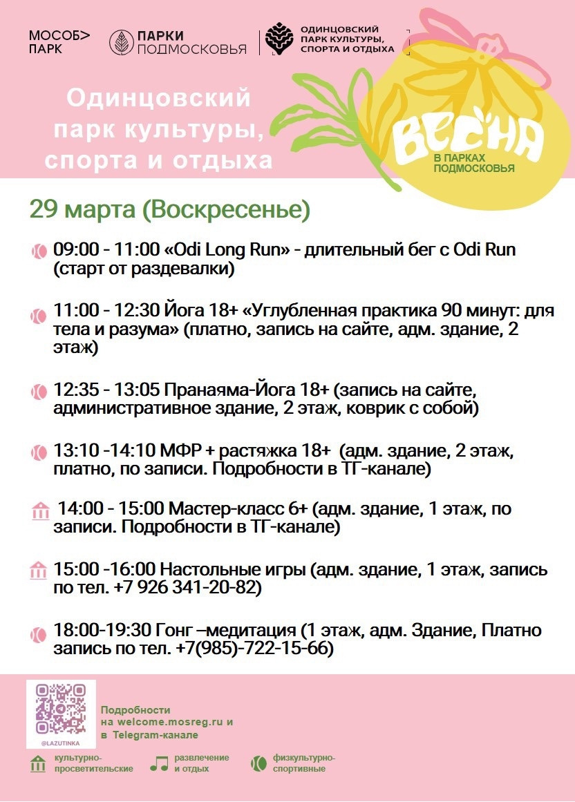 Друзья, представляем вашему вниманию афиши на следующую неделю 💚 В афишах возможны изменения, актуальное расписание смотрите на официальном сайте парка http://clck.ru/3BLjDT Записаться на йогу (запись открывается накануне занятия) 👉🏼 https://clck.ru/3PrQaC Записаться на МФР 👉🏼 clck.ru/3PqNzu 📲 Записаться на медитацию 👉🏻 +79264268362 Записаться на «Мафию» (18+) 👉🏻 https://forms.yandex.ru/u/69a6f164d046889c20c0c1d2/ 📲 Записаться на гонг-медитацию 👉🏻 +79857221566 📲 Записаться на настольные игры 👉🏻 +79263412082 📲 Записаться на творческий мастер-класс 👉🏻 +79263412082 #АфишиНаНеделю #ПаркиОГО #Одинцовскийпарк #Лазутинка У Лазутинки теперь есть канал в MAX. Подписывайтесь!