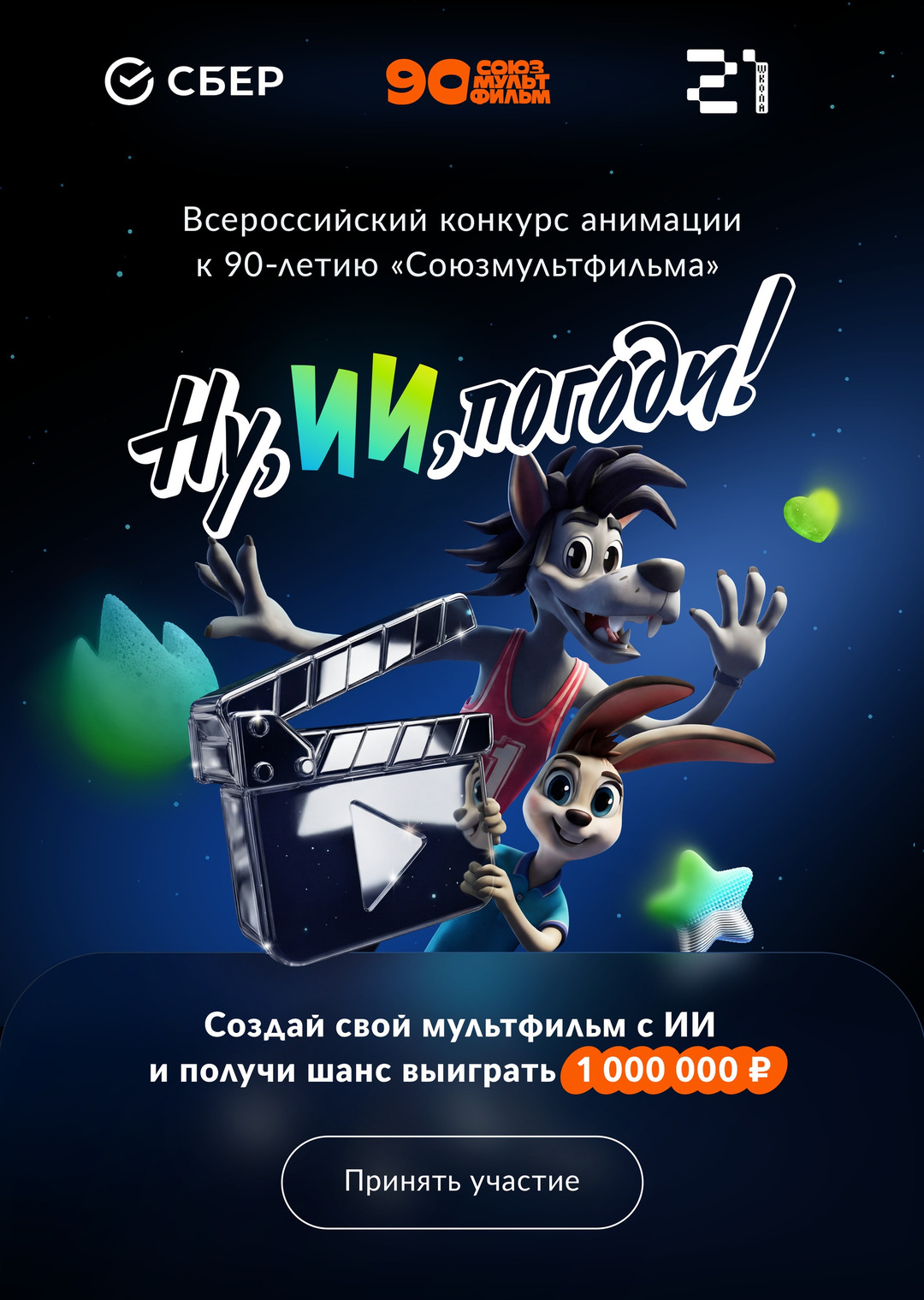 🎬 Ну, ИИ, погоди! Семейный конкурс анимации к 90-летию «Союзмультфильма»! В 2026 году «Союзмультфильму» исполняется 90 лет! К юбилею Сбер, «Союзмультфильм» и «Школа 21» объявляют о запуске Всероссийского конкурса анимации. ⭐ Как принять участие? • Создайте оригинальный анимационный видеоролик с поздравлением «Союзмультфильма» с юбилеем длительностью от 30 до 60 секунд. Можно использовать персонажей «Союзмультфильма» или придумать своих героев. • Примените в ролике технологии искусственного интеллекта — ГигаЧат, Kandinsky и другие отечественные нейросети — на любом этапе: генерация изображений, анимации, сценария и тд. • Загрузите ролик на Диск и прикрепите ссылку на файл в специальной регистрационной форме на сайте конкурса: vk.cc/cTsmna • Один участник может подать не более 5 работ. • Важно – в работе должны присутствовать цифры 9 и 0, символизирующие 90-летие киностудии. ⭐ Призовой фонд конкурса — один из самых значимых в истории любительских анимационных соревнований России! 🥇Победитель получит денежный приз в размере 1 000 000 рублей 🥈Второе место — 250 000 рублей 🥉Третье место — умный телевизор Sber. Также мы вручим 10 поощрительных призов. Ролики участников будет оценивать экспертное жюри из медиаиндустрии, сферы производства контента и анимации. Приём конкурсных работ открыт до 10 апреля 2026 года. ⭐ Подробности ищите на сайте конкурса: vk.cc/cTsmna Ждём ваши работы! #Союзмультфильм #НуИИПогоди #АнимацияБудущего #МультфИИльм