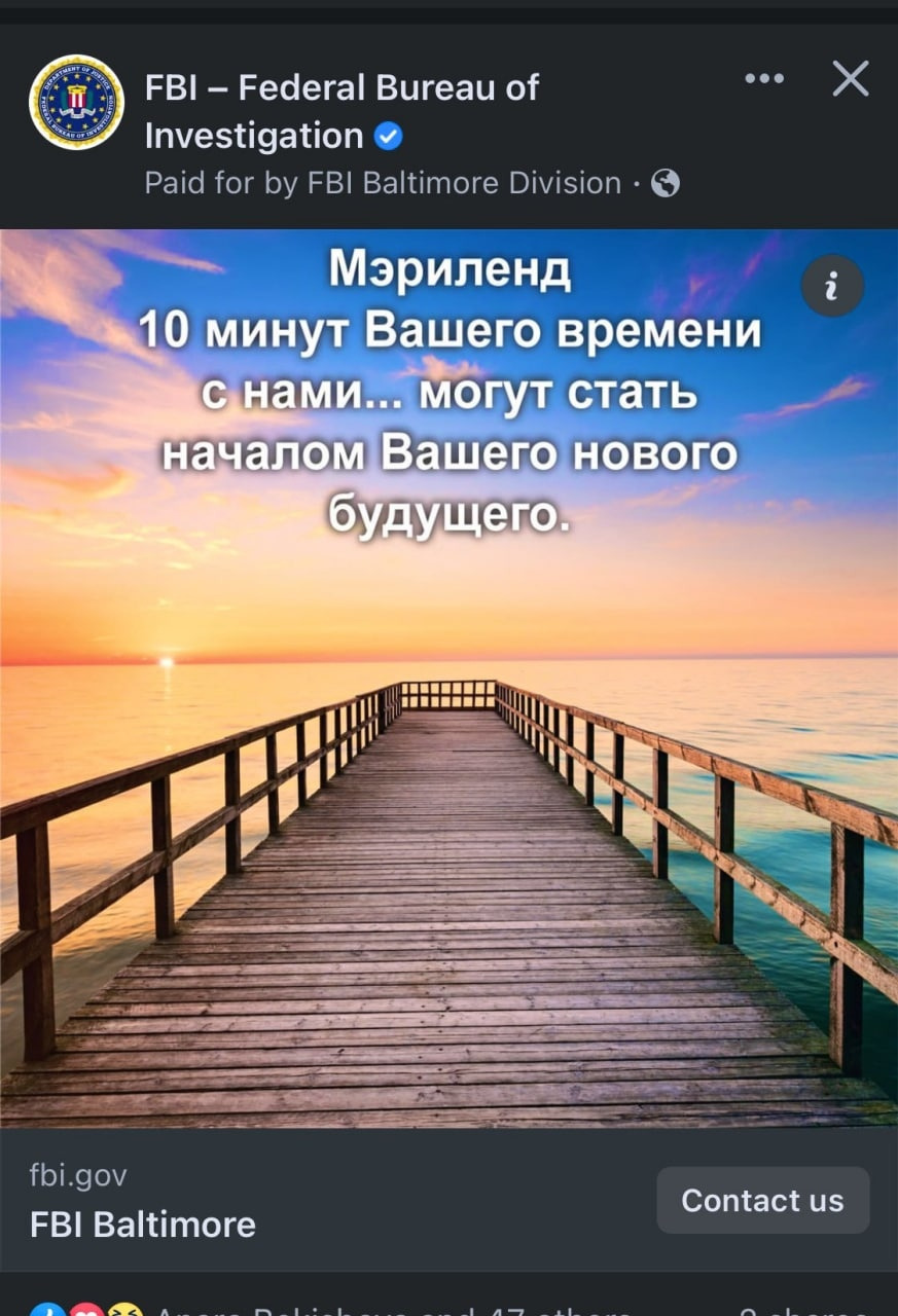 ФБР совсем обнаглели!? Крутится на русскоязычных пользователей. Ранее спецслужба точечно показывала рекламу в Нельзябуке на мобильники рядом с посольством России в Вашингтоне.