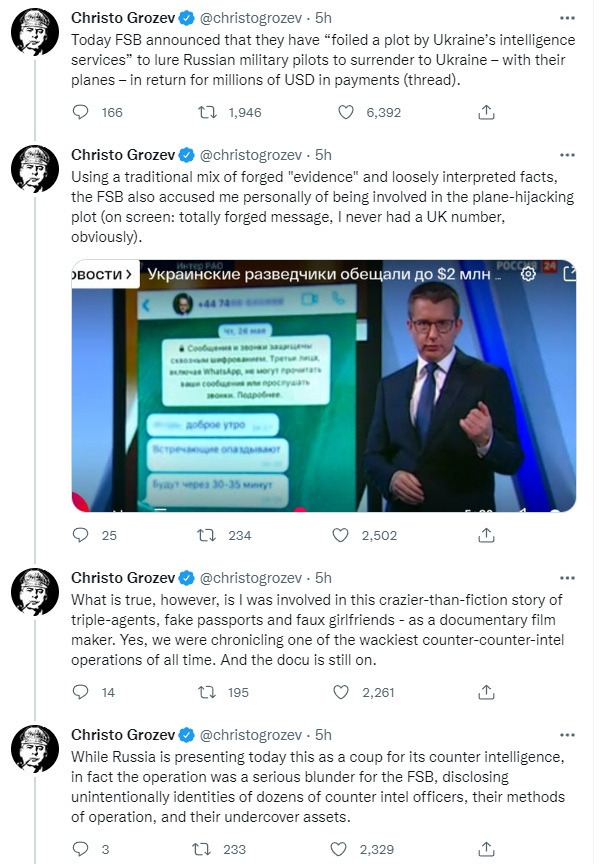 Христо Грозев ответил на обвинения ФСБ в его участии в спецоперации украинских спецслужб по вербовке российских летчиков. По словам расследователя, операцию организовали бывшие украинские «оперативники», а не Главное управление разведки Минобороны Украины. Несколько российских летчиков вышли с ними на связь и прислали видео из кабин своих самолётов. Но вскоре украинцам стало понятно, что пилоты общаются под руководством контрразведки ФСБ и общение превратилось в «двойную игру». Стороны лишь пытались выяснить больше информации и, в итоге, остались ни с чем — Украина без самолётов, а ФСБ без украинских вербовщиков. Сам Грозев утверждает, что участвовал как журналист и Bellingcat* помогал снимать документальный фильм об этой истории * — объявлена в России иноагентом
