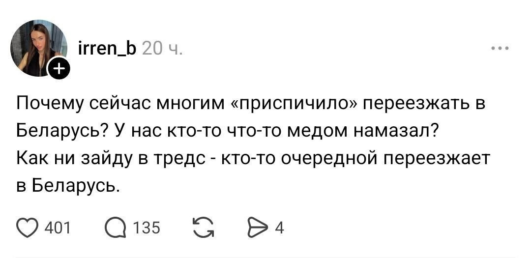 Вы готовитесь к переезду? А вот многие наши соотечественники планируют уехать на ПМЖ в Беларусь. Все потому, что у батьки никаких блокировок, ниже цены, меньше налоги и нет языкового барьера. Сейчас жилье в картофельной цитадели уже малость подпрыгнуло из-за релокантов, а в ближайшем будущем прогнозируют больший рост из-за наплыва россиян. Кто бы мог подумать, еще пару лет назад, что в Беларусь все рванут за свободой. А усатый и не против прибавления рабочей силы