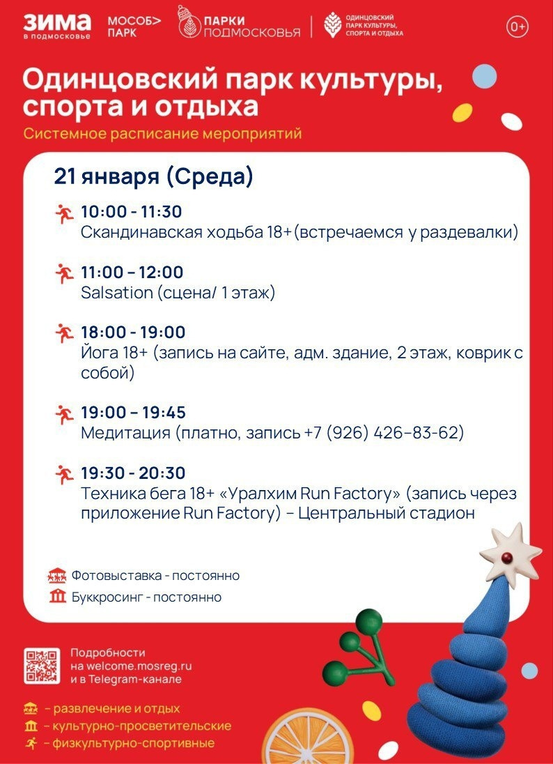 👆🏼Представляем вашему вниманию афишу на завтра. Ознакомиться с расписанием на неделю вы можете на официальном сайте парка 👉 clck.ru/3BLjDT Записаться на йогу 👉 clck.ru/3PrQaC Записаться на интервальную тренировку по бегу 👉 clck.ru/3PrPvG 📲 Записаться на медитацию 👉🏼 +79264268362 #Лазутинка #ПаркиОГО #ОГО #Одинцовскийокруг #ЗимаВПодмосковье