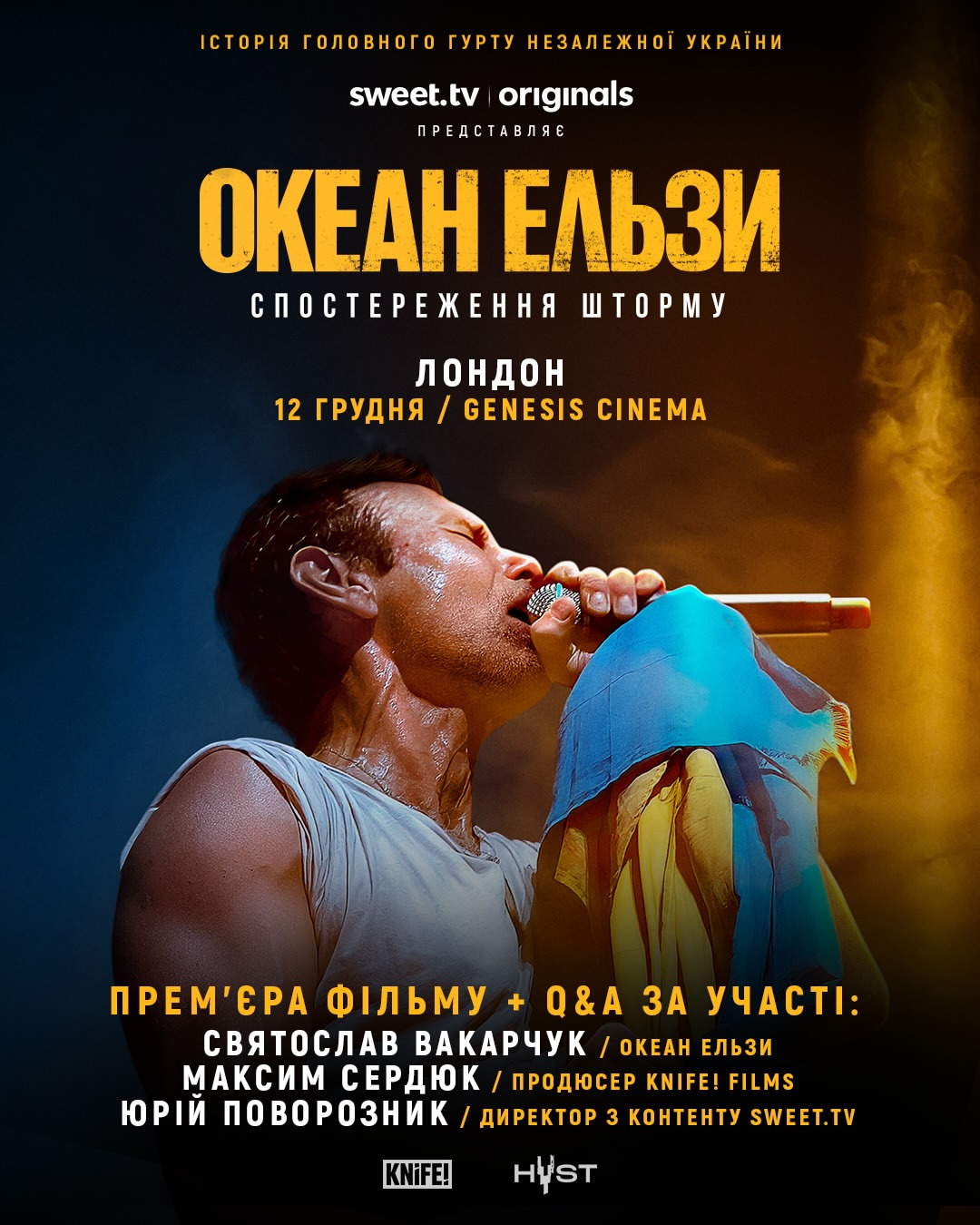 Лондон, запрошуємо вас на спеціальний показ «Океан Ельзи: Спостереження Шторму» за участі Святослава Вакарчука, продюсера KNIFE! Films Максима Сердюка і директора з контенту SWEET.TV Юрія Поворозника. Це історія головного гурту незалежної України, пісні якого об’єднують мільйони людей по всьому світу і є символом свободи, любові і боротьби. Британська премʼєра відбудеться 12 грудня у Genesis Cinema. Мова: українська, з англійськими субтитрами Організовано @hystagency. Квитки — за посиланням у біо. ENG: Okean Elzy: Stormwatch // UK Premiere + Q&A 12 December, Genesis Cinema, London We are delighted to announce a special screening of the highly anticipated biographical documentary Okean Elzy: Stormwatch, followed by an in-person Q&A with Sviatoslav Vakarchuk (Okean Elzy), Maksym Serdiuk (Producer KNIFE! Films), and Yurii Povoroznyk (Chief Content Officer SWEET.TV). This powerful documentary traces the story of Okean Elzy, the iconic band of independent Ukraine whose songs have united millions and become a symbol of freedom, love, and resistance. Directed by Artem Hryhorian, Okean Elzy: Stormwatch weaves together rare archival footage, previously untold stories, and intimate reflections from those who shaped the band’s extraordinary journey. Audiences will witness the band’s rise to international acclaim - its creative breakthroughs, personal and artistic conflicts, and the turbulent historical moments that reshaped both the musicians and Ukraine. Join us on 12 December at Genesis Cinema for this exclusive premiere, an unforgettable big-screen experience, and a live conversation with the creators behind the film. Language: Ukrainian with English subtitles Okean Elzy: Stormwatch / dir. Artem Hryhorian / Ukraine / 2025 / 125 mins Presented by HYST Agency Tickets via link in bio