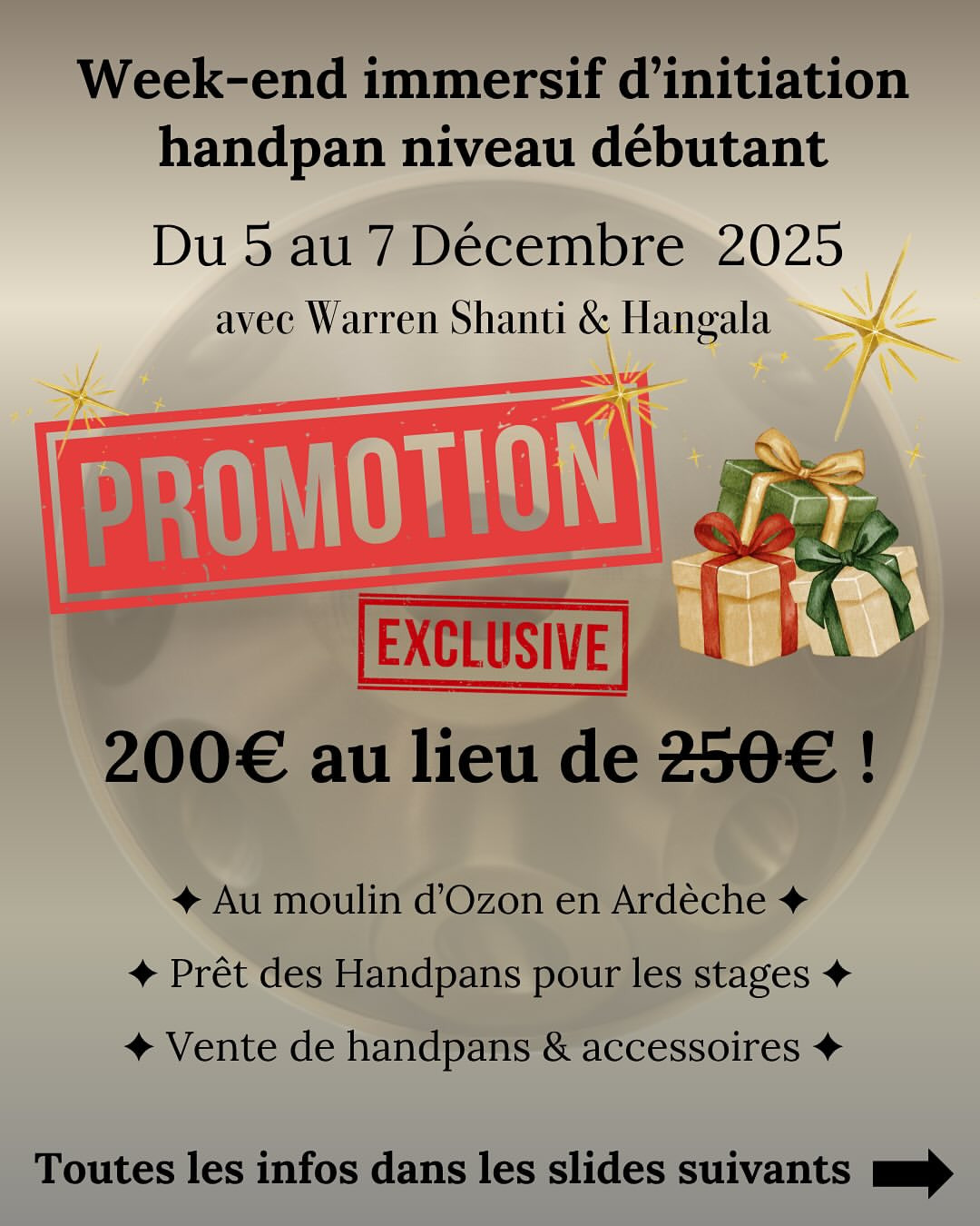🎄 C’est Noël avant l’heure ! Offre-toi un week-end immersif de handpan en Ardèche pour découvrir cet instrument magique 🎶 ✨ Dernier stage débutant de l’année du 5 au 7 Décembre + ambiance de Noël + surprises = 50 € de réduction exclusive ! ➡️ Seulement 200 € + hébergement & repas Si l’appel du handpan vibre dans ton cœur… c’est le moment ou jamais 💫 (lien dans ma bio) #handpan #stagehandpan #retraitehandpan #handpanworkshop